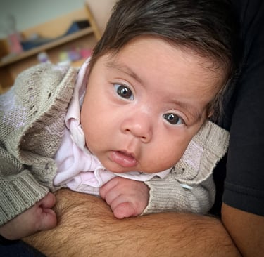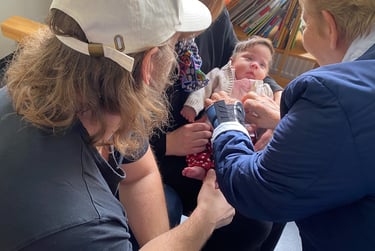 Irene und Josef, Emilias bisherige Pflegeeltern, waren gerade mit Emilia im "Spielzimmer" angekommen, als wir auch schon dazu durften. Der kurze Weg den Flur herunter fühlte sich an wie eine Ewigkeit... und da war die Tür. Dahinter unsere Tochter...