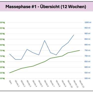 Aufgebaut wurde in der ersten Massephase das Gewicht von 5,5 kg auf 7,5 kg - also ganze +2 kg in 12 Wochen. Das entspricht rund +170g (oder +3% des ursprünglichen Körpergewichts) pro Woche.