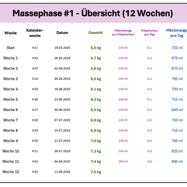Die erste Massephase war nicht nur ein voller Erfolg auf der Waage, sondern auch ein Abenteuer. Zwei Kilo schwerer, sieben Zentimeter länger und knapp 500 leergetrunkene Fläschchen* später können wir sagen: Das 5x5-Prinzip funktioniert – simpel, effektiv und absolut babytauglich 😆.