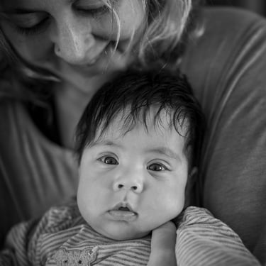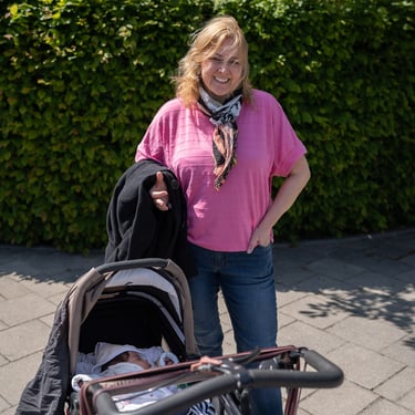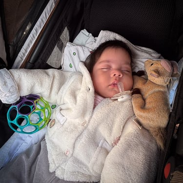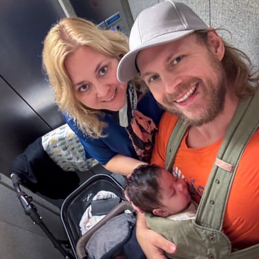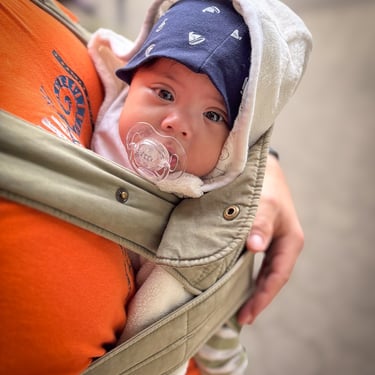 Mittwochmittag kam dann wieder Besuch von Emilias Bereitschaftspflegeeltern. Davor hatten wir drei aber noch eine kleine Mission: Kuchen vom Bäcker holen. Und im Vorbeigehen noch kurz die Überweisung zum Kardiologen vom Kinderarzt holen. Normalerweise eine Sache von 20min - gemütlich zu Fuß. Aber nicht mit Baby. Ok, wir versuchten es auch erstmals direkt mit der Bauchtrage, statt Kinderwagen. Das sah in etwa so aus: