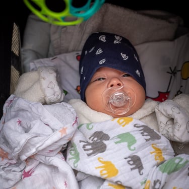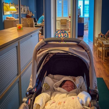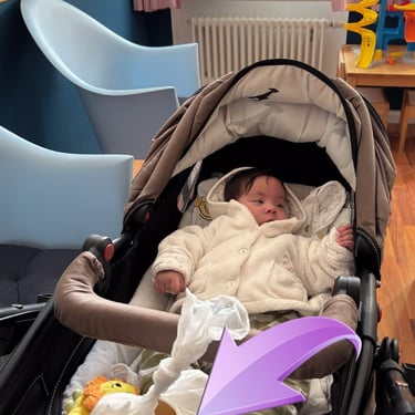 09:24 Uhr: Baby gefällt es irgendwie nicht mehr in der Bauchtrage. Umbau in den Kinderwagen (der war zum Glück schon dabei)